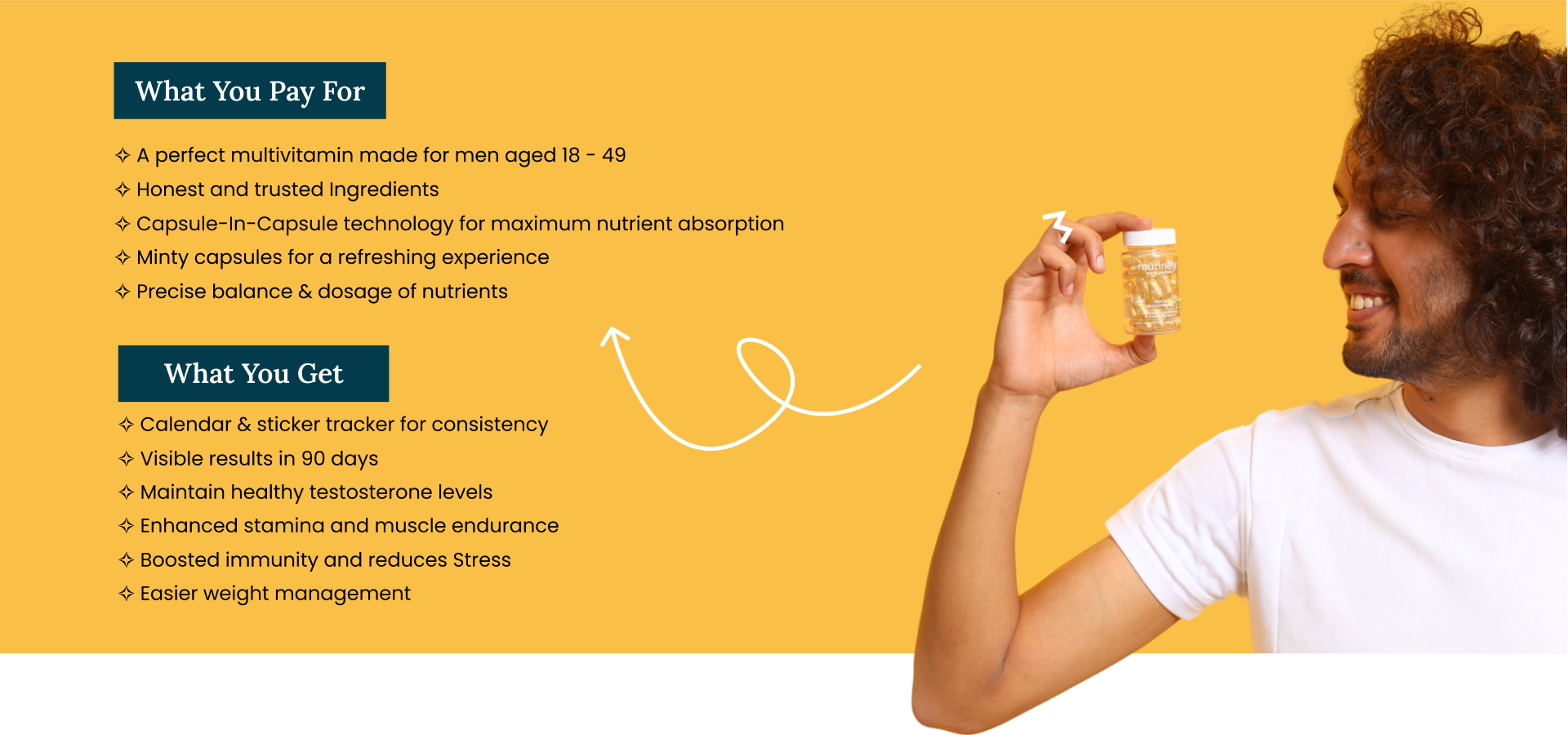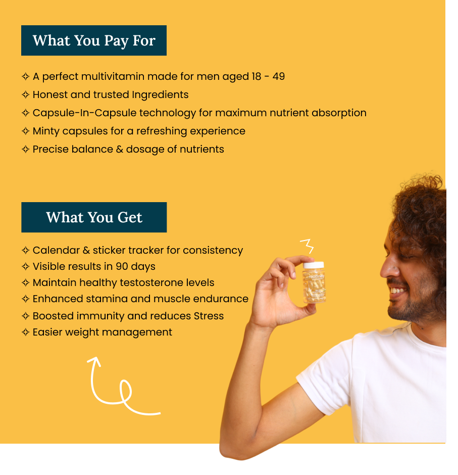 Routinely" understands the dynamic needs of men in this age group. With our Capsule in Capsule Technology, we make it simple to intake essential nutrients with just one pill a day, offering a convenient solution to support your overall health.