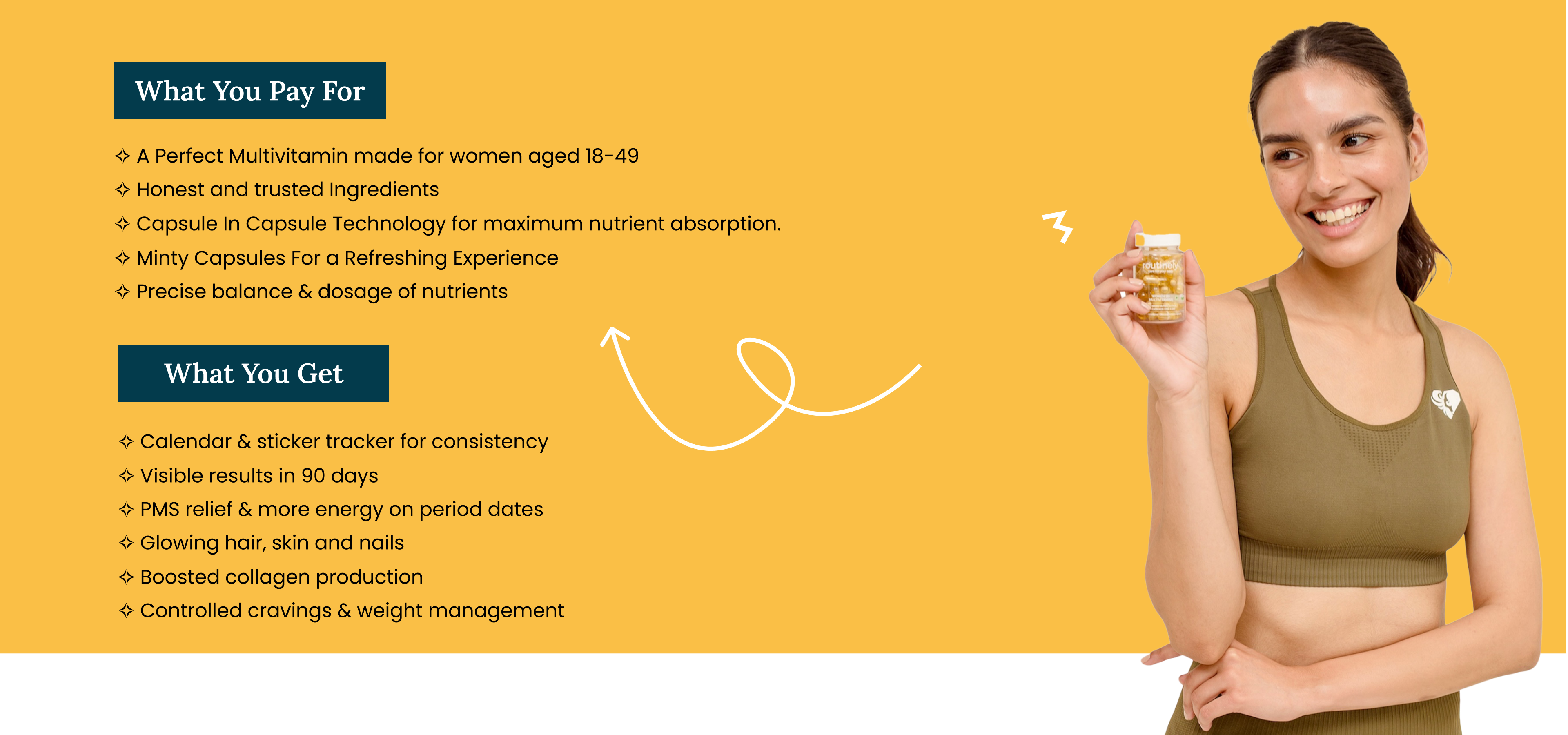 "Routinely" recognizes the diverse needs of women in this age group. Our Capsule in Capsule Technology simplifies your daily routine, combining all the essential nutrients in one pill to ensure you get comprehensive support for your well-being.