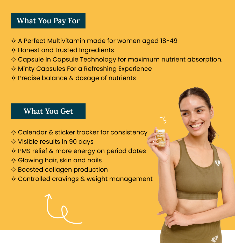 Veg DHA supports brain health, Iron addresses potential deficiencies, and Cranberry Extract is beneficial for urinary tract health. These hero ingredients are thoughtfully included to cater to the unique needs of women.