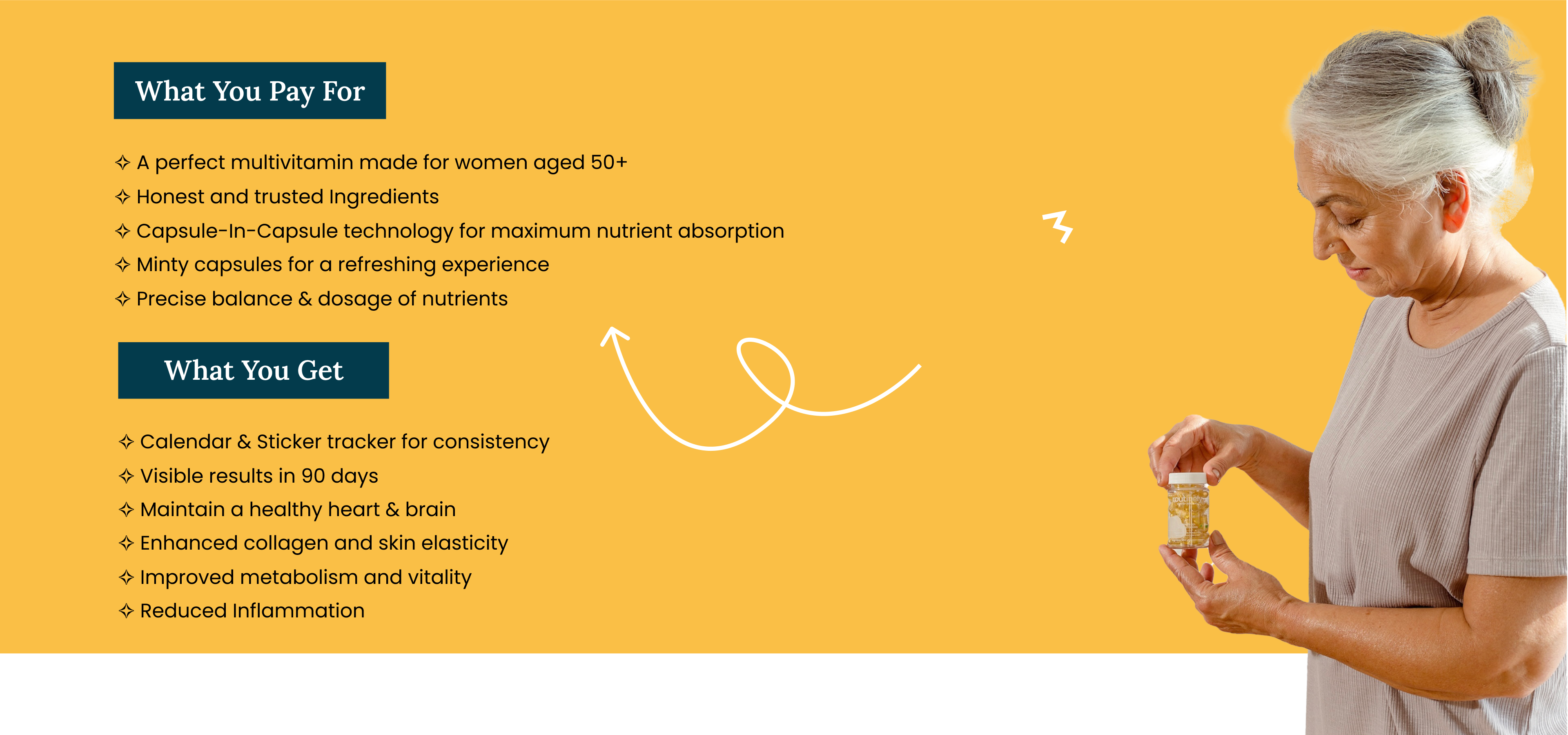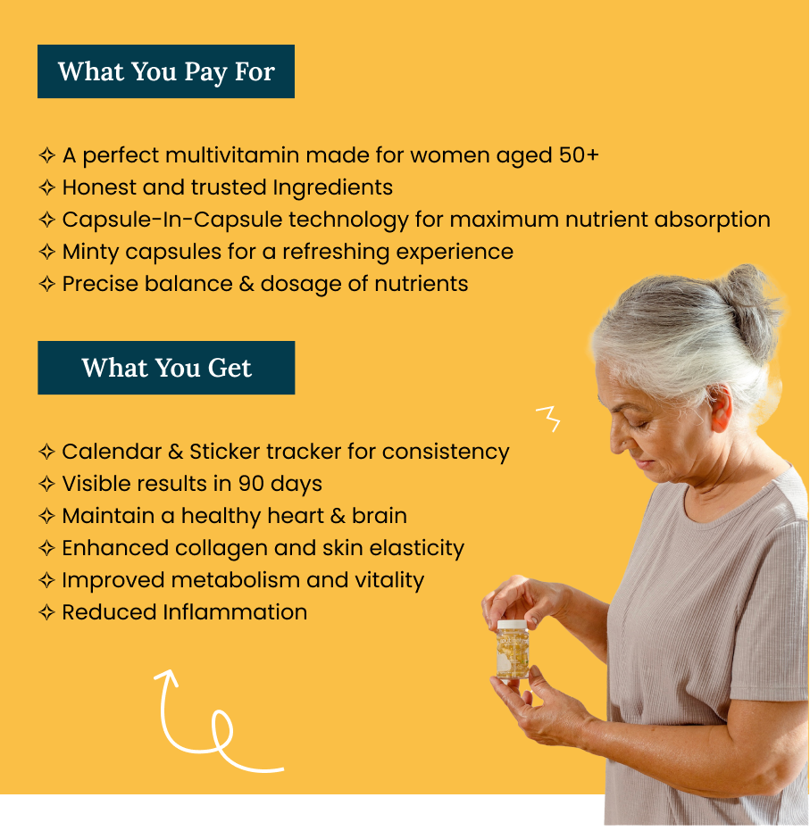 Boost your energy and well-being with our tailored multivitamins for women aged 50+. Get the nutrients you need for a healthier you.